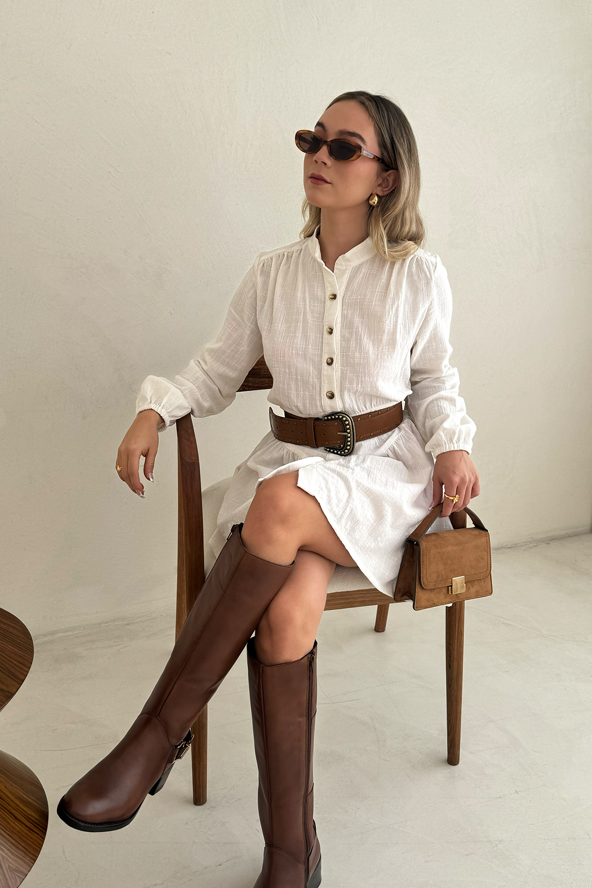 Vestido tipo camisero con cuello clásico y botones frontales. Detalles fruncidos en hombros, cintura y falda que aportan volumen y estilo. Elástico en la espalda para un ajuste cómodo.