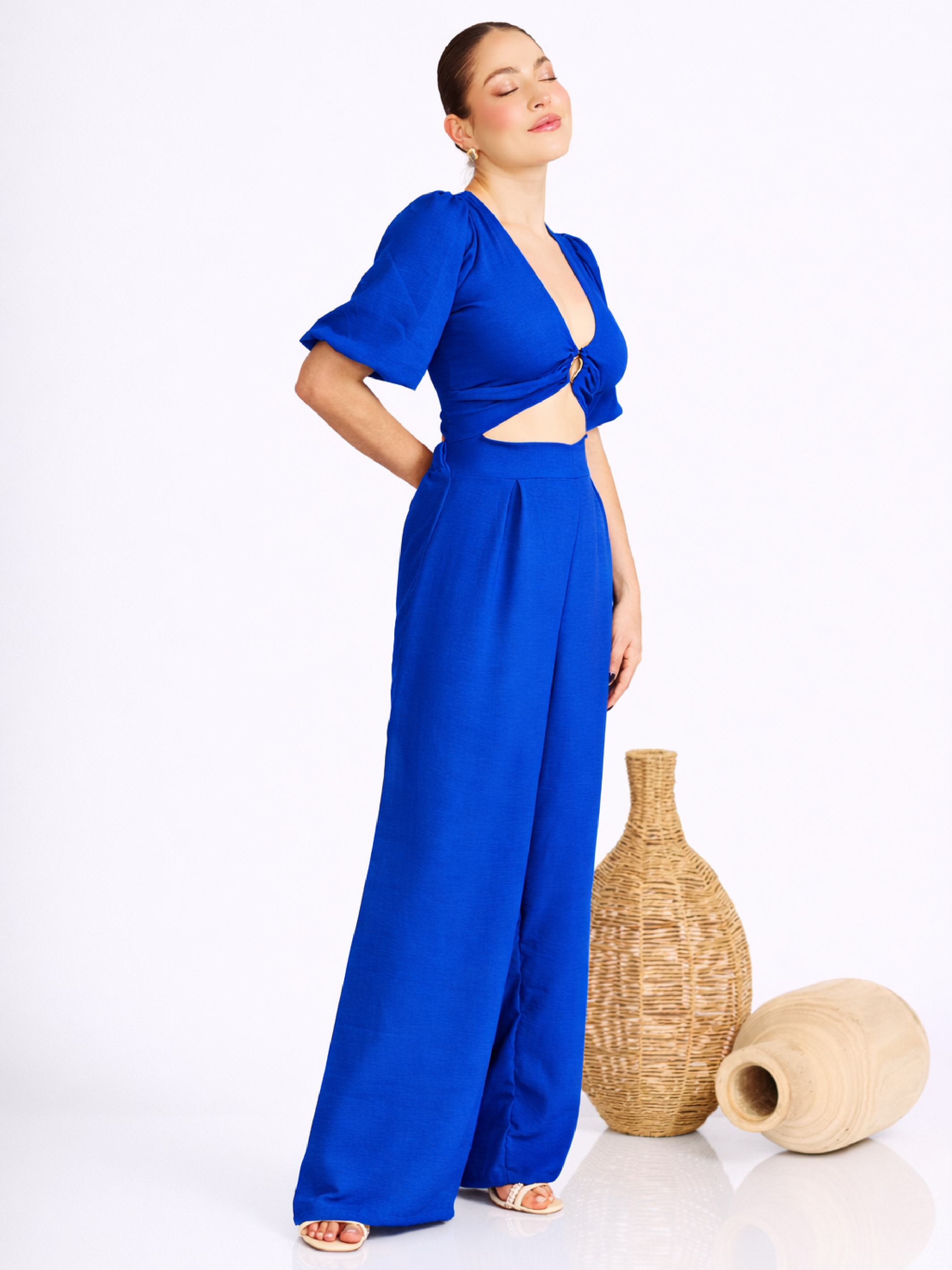 Enterizo de diseño moderno y femenino en tono turquesa. Presenta escote en V profundo con detalle fruncido y accesorio metálico central, sutil abertura bajo el busto y mangas amplias de caída ligera. Su pantalón de tiro alto y pierna ancha estiliza la figura y aporta movimiento elegante.