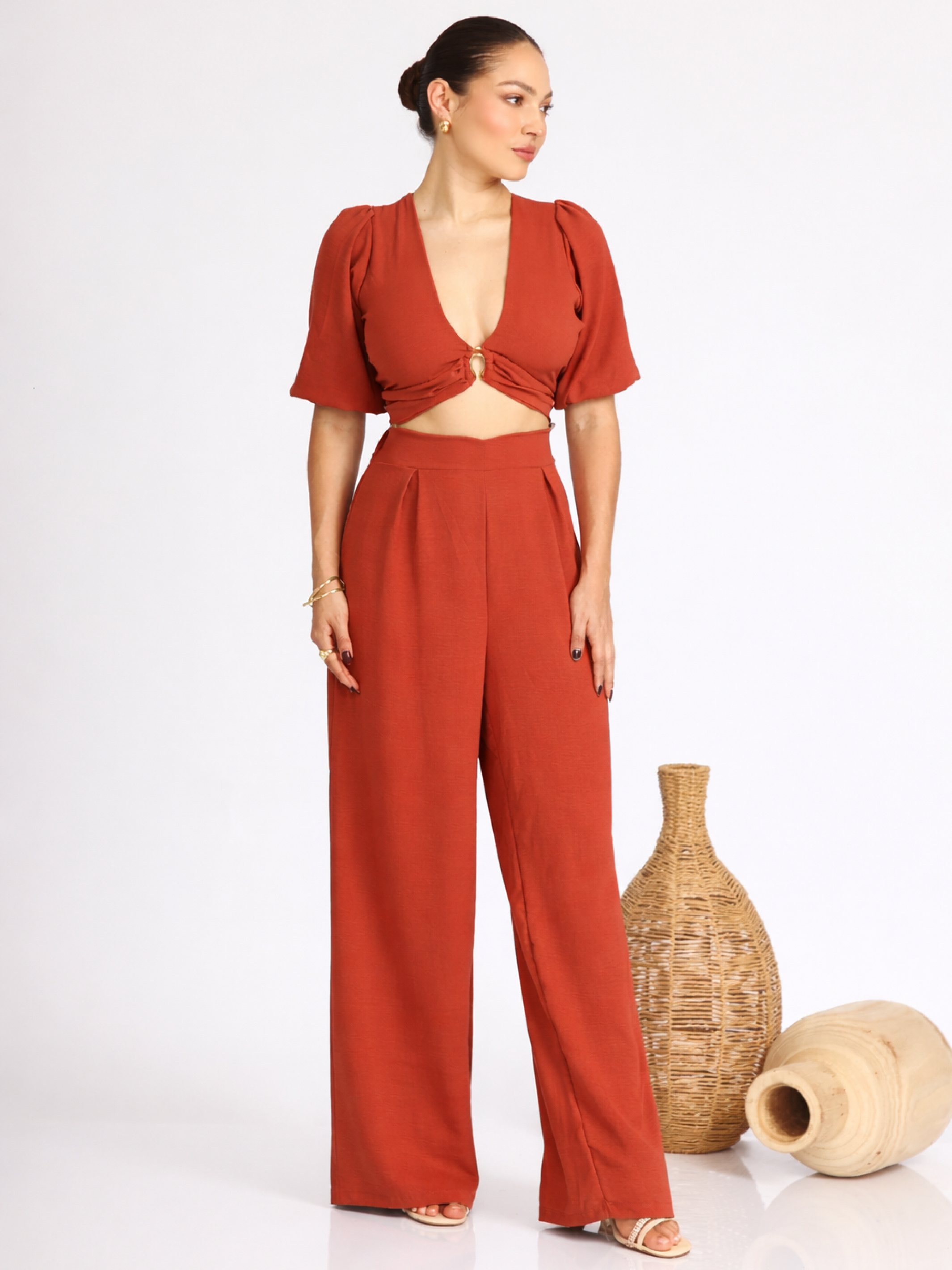 Enterizo de diseño moderno y femenino en tono turquesa. Presenta escote en V profundo con detalle fruncido y accesorio metálico central, sutil abertura bajo el busto y mangas amplias de caída ligera. Su pantalón de tiro alto y pierna ancha estiliza la figura y aporta movimiento elegante.