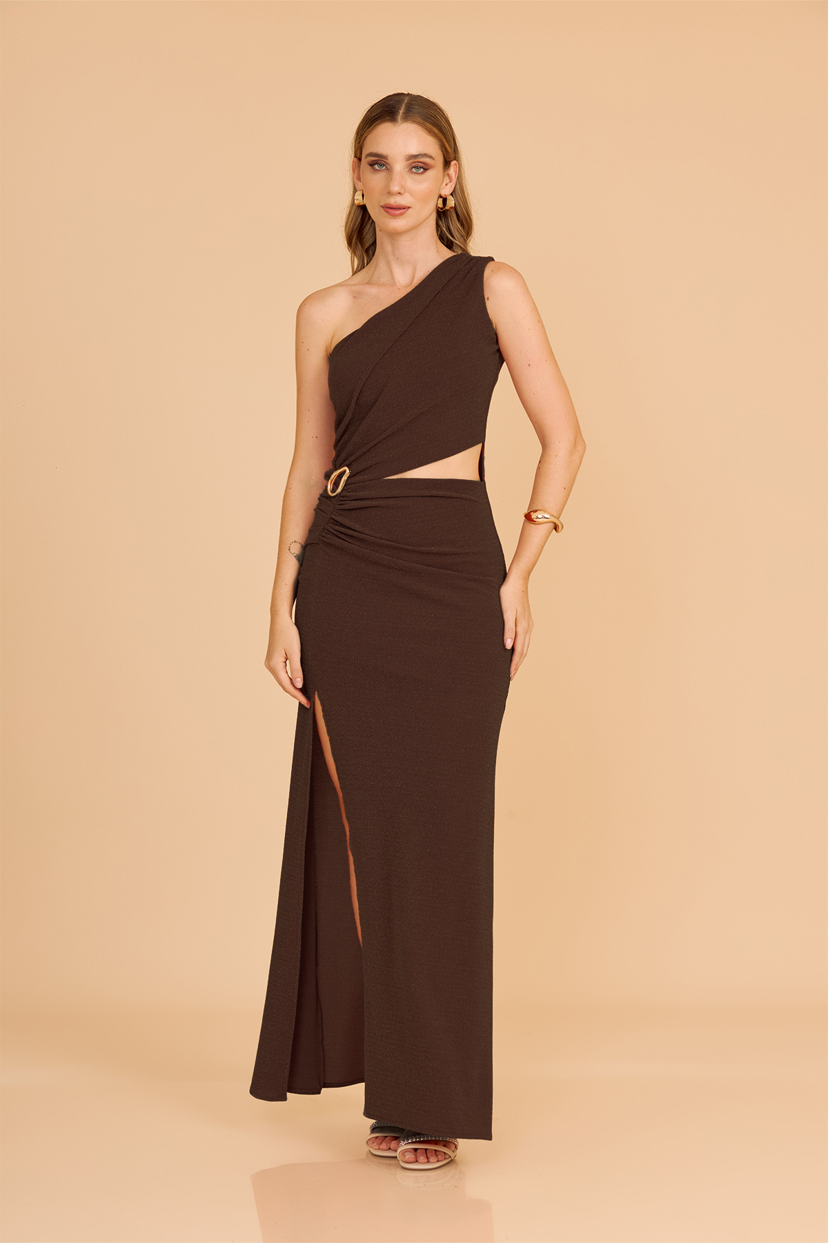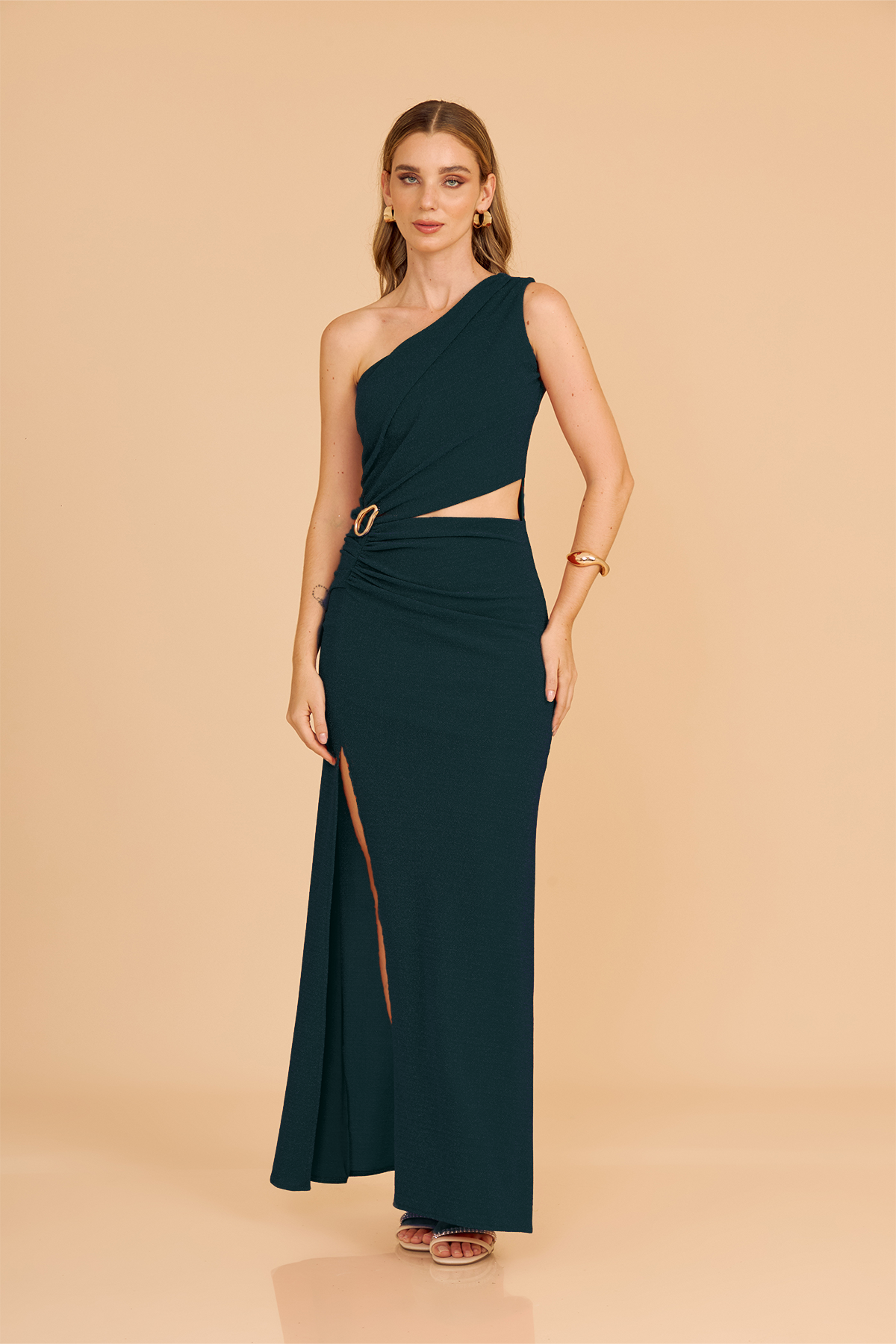 Vestido de un hombro combina un diseño drapeado con abertura lateral y un delicado detalle metálico en la cintura.
