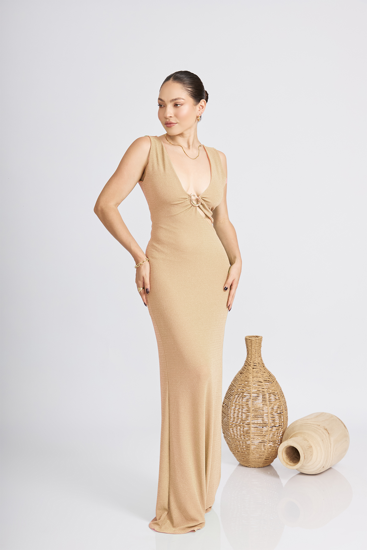 Con diseño ajustado, detalles cut-out en la cintura y aro decorativo, este modelo estiliza tu figura y resalta tu estilo único. Perfecto como vestido para fiestas, bodas y cócteles, combina con accesorios dorados o nude.