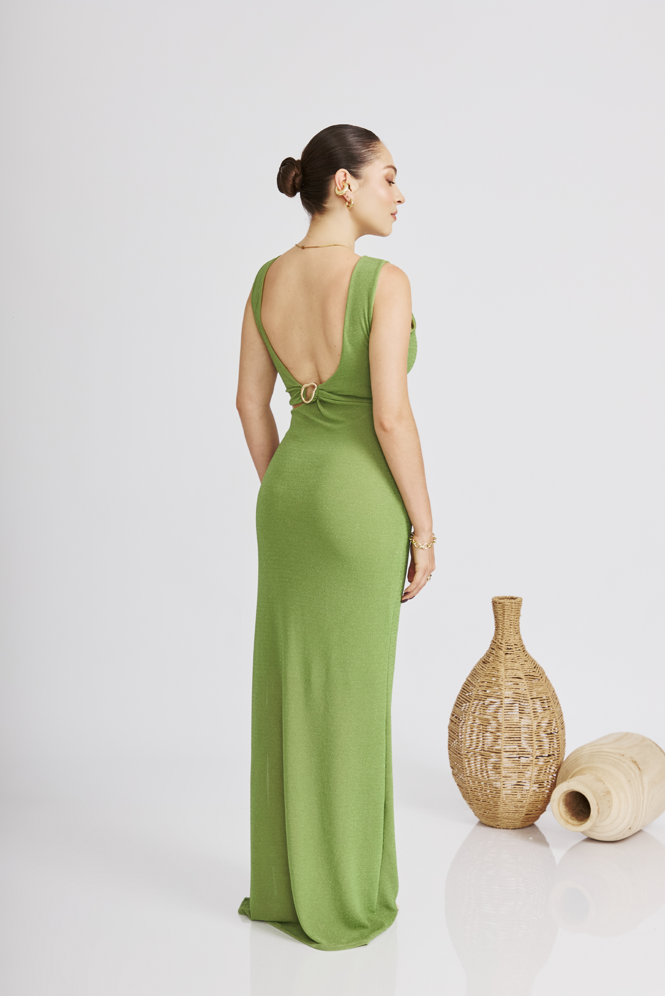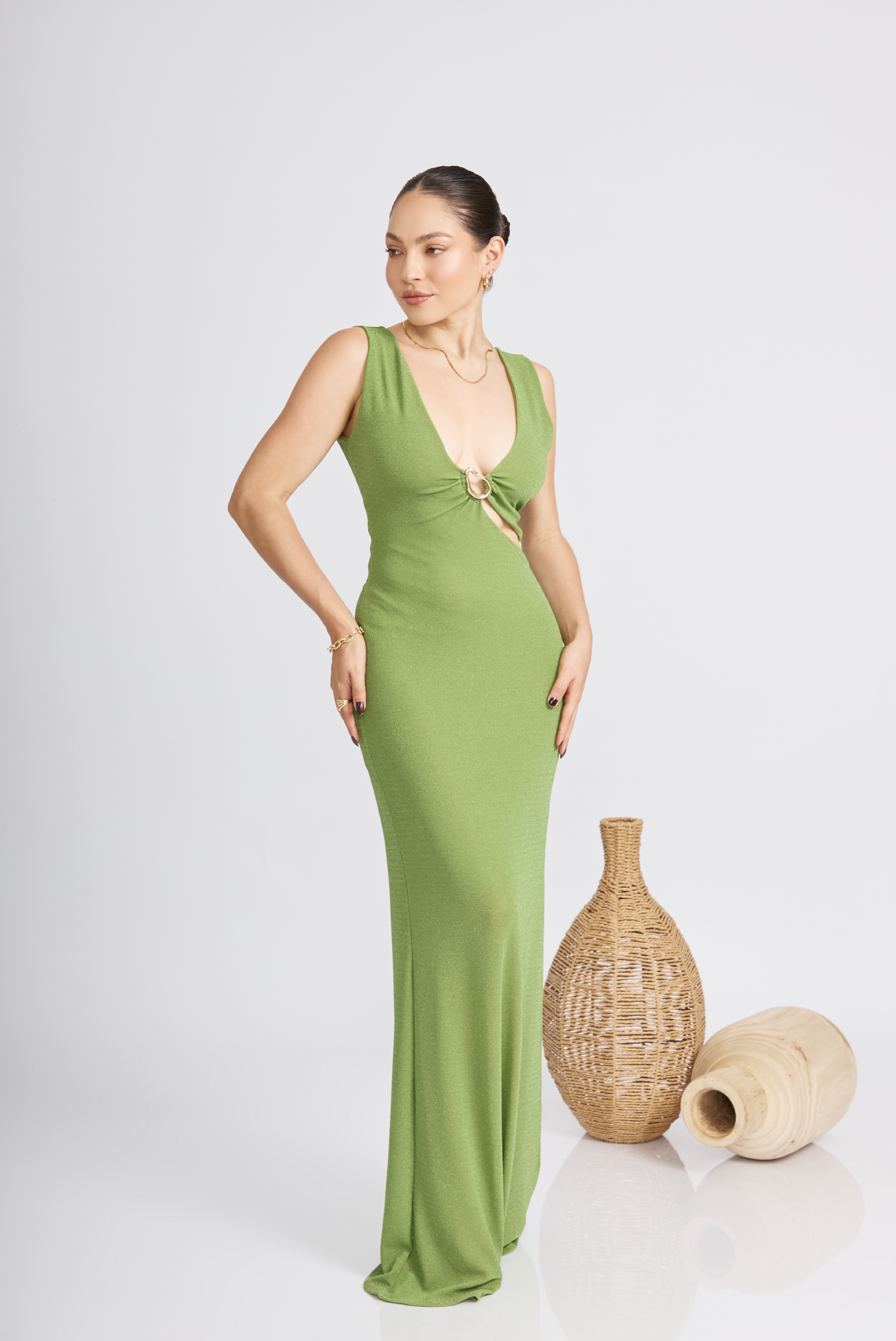 Con diseño ajustado, detalles cut-out en la cintura y aro decorativo, este modelo estiliza tu figura y resalta tu estilo único. Perfecto como vestido para fiestas, bodas y cócteles, combina con accesorios dorados o nude.