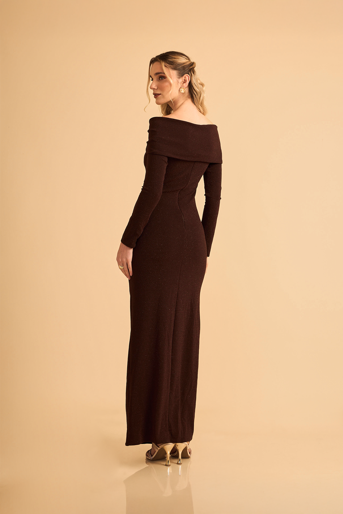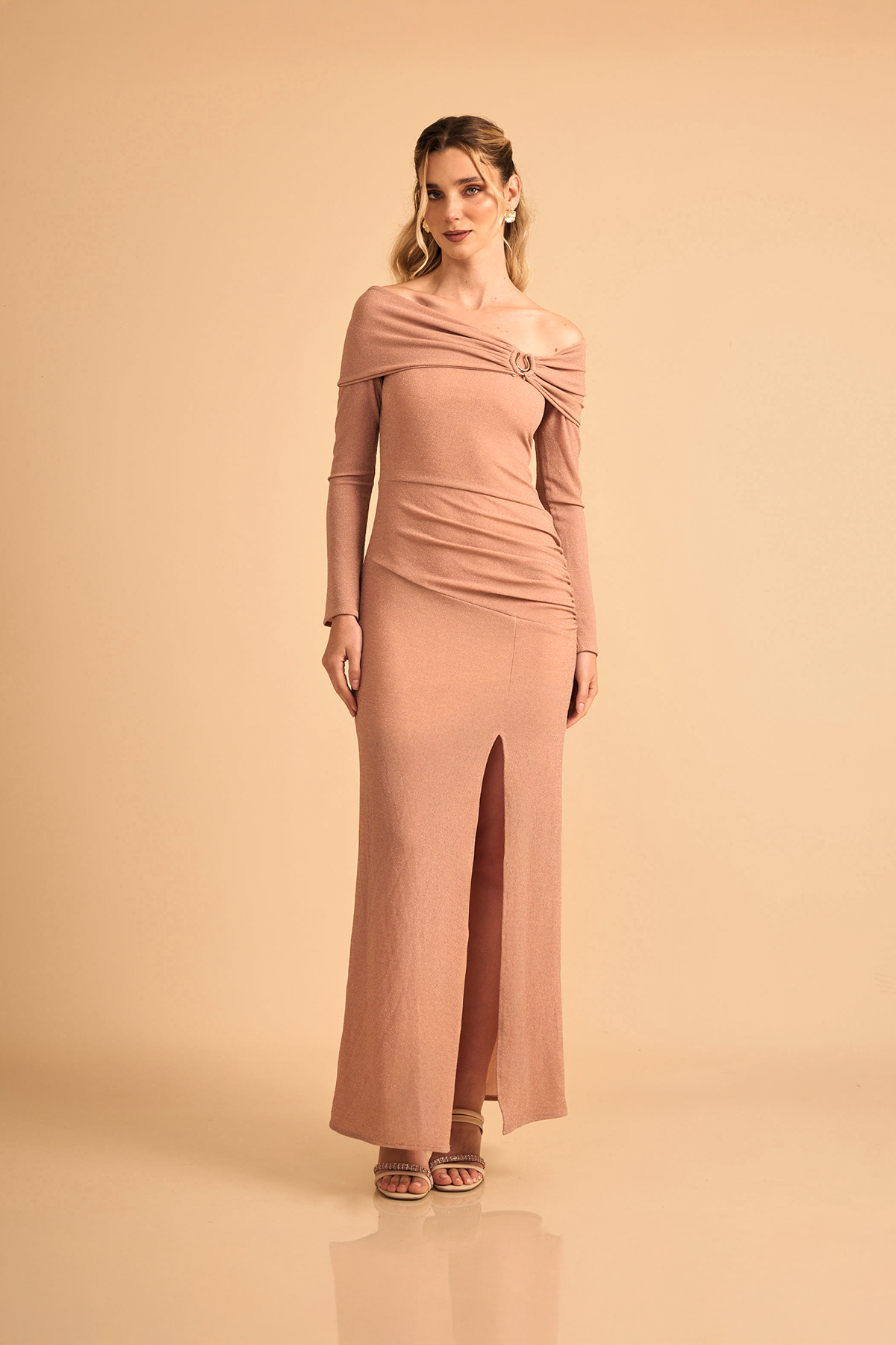 Vestido largo de tela lame y forro licrado. Mangas off shoulder con detalle de avío dorado metálico en delantero. Falda con fruncido y abertura en delantero.
