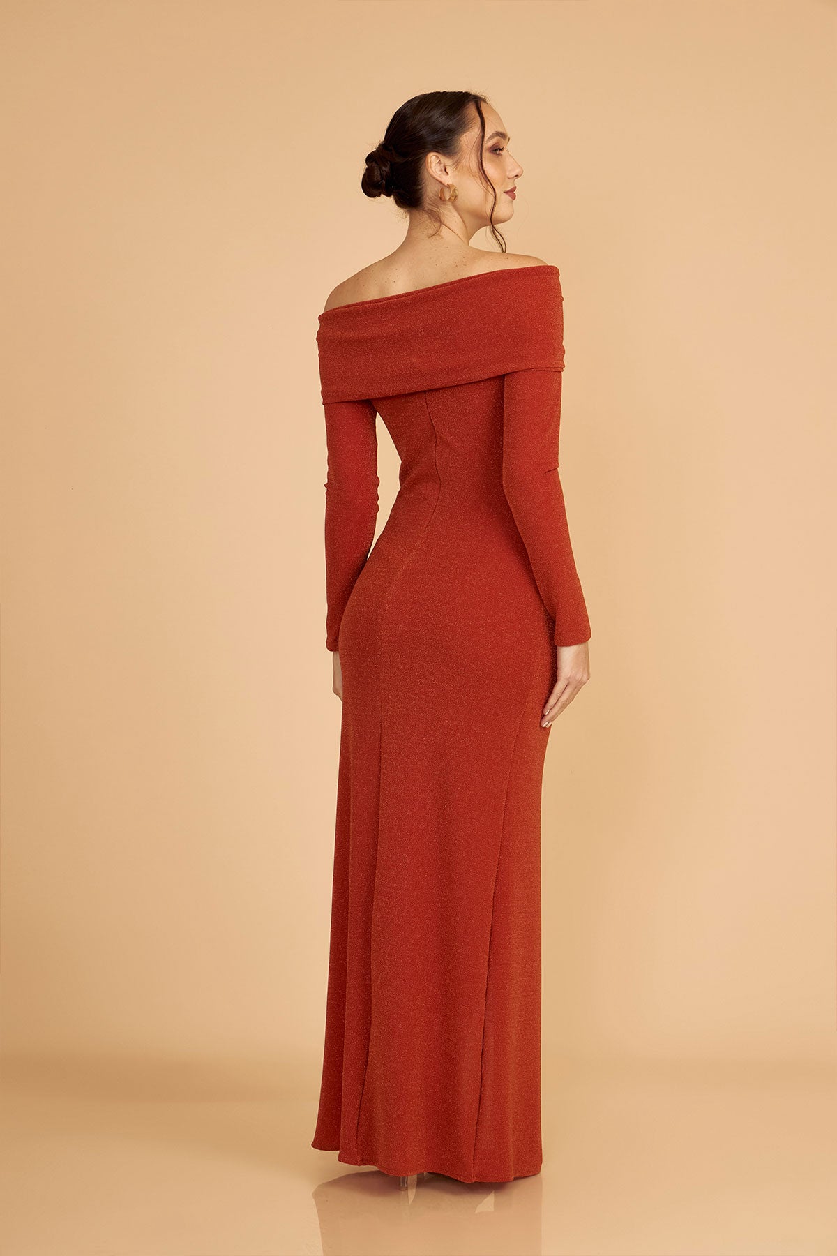 Vestido largo de tela lame y forro licrado. Mangas off shoulder con detalle de avío dorado metálico en delantero. Falda con fruncido y abertura en delantero.